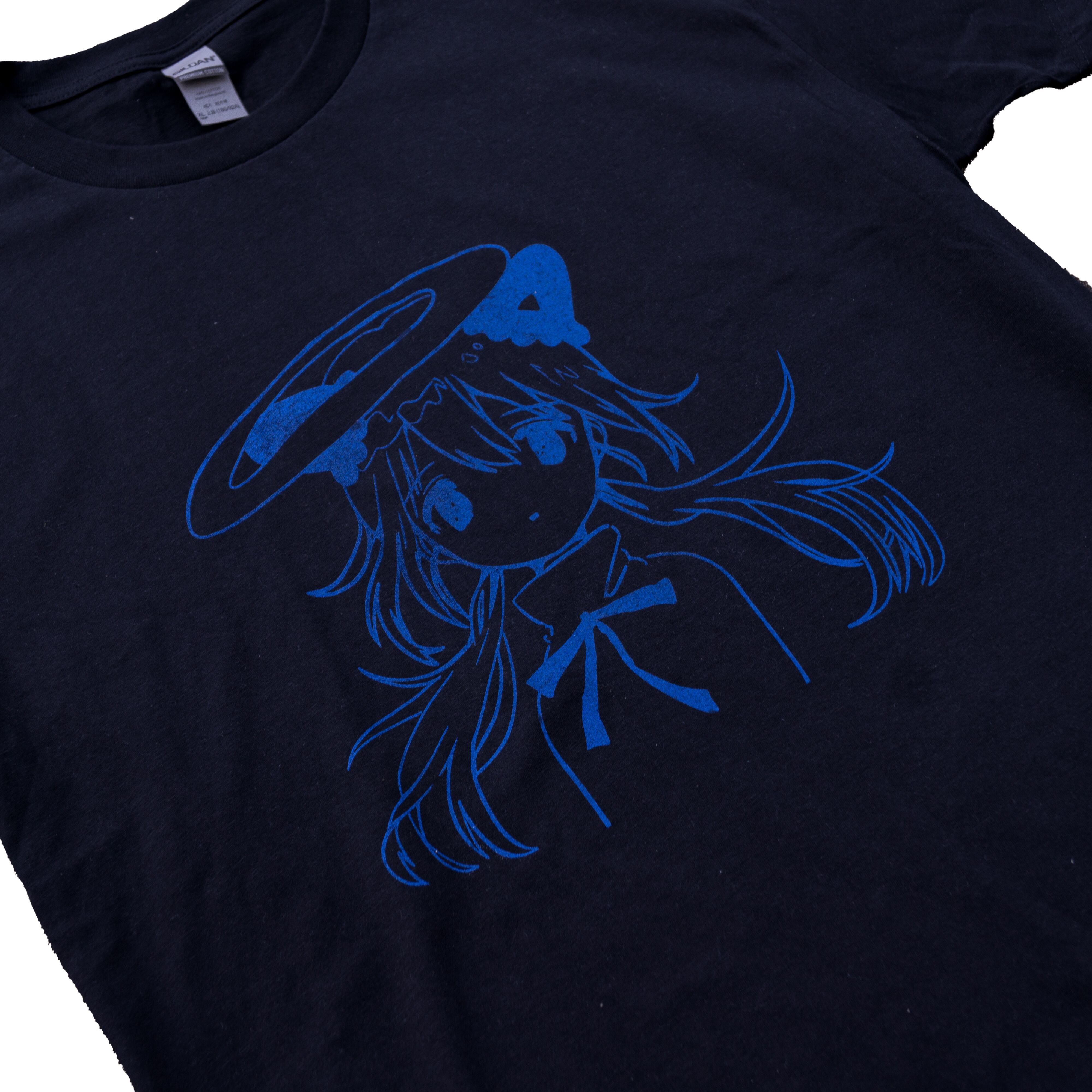 黒のTシャツ地には、ラメ入りのブルーインクがシルクスクリーンで丁寧に手刷りされています。近くで見れば見るほど、ラメの輝きがキラキラと光り、見る人の目を惹きつけるでしょう。サイズはXLのみで、ゆったりとしたシルエットが嬉しいポイントです。普段使いはもちろん、友人とのカジュアルな集まりやイベントなど、幅広いシーンで活躍します。アバ子天使Tシャツを着ることで、あなたのスタイルに可愛らしさとちょっとしたラグジュアリー感をプラスできる一品です。