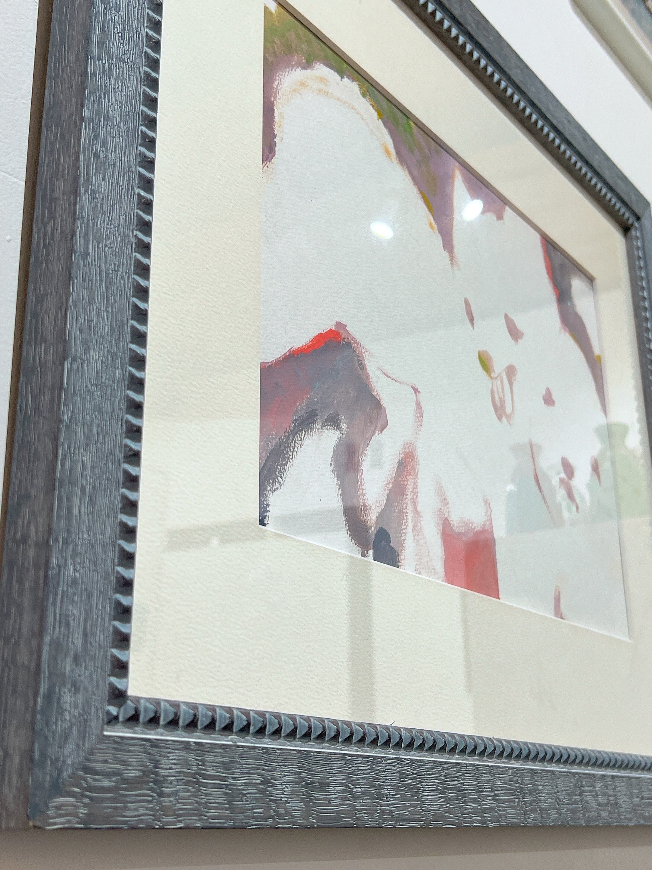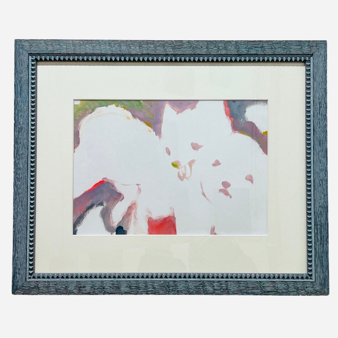 額縁に入った2匹のこいぬの絵画です。白や淡い色調を基調としており、一部に赤や緑、灰色のアクセントが見られます。この絵は、柔らかなタッチで描かれた抽象的な作品のように思われます。